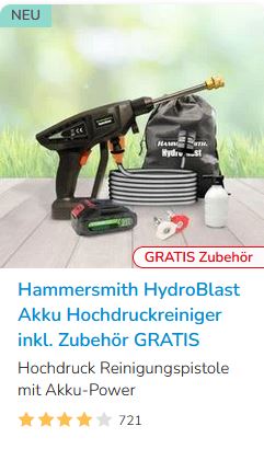 ![]() | Der Hammersmith HydroBlast Akku Hochdruckreiniger Im Spot wurde gezeigt, wie man ein Auto damit abstrahlen und somit vom Schmutz befreien kann, oder eben das Moos vom Gartenweg entfernt wird, oder eben, auf einfache Weise auch die Blumen gießen könnte. Nachdem ich den Spot zweimal gesehen habe, war ich echt angefixt. |