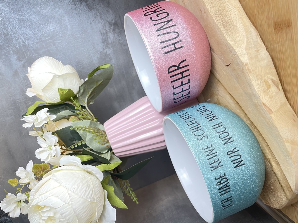 Ihr liebt beide Sorten, nur die passende Schüssel dazu hat noch gefehlt. Aber jetzt ist es so weit. In zwei tollen Style wird es meine Schüssel geben: Für euch Jungs gibt es eine tolle, hellblaue Schüssel mit einem guten Laune Spruch parat. Und das Beste: beide Varianten habe eine Glitzeroptik. Gefällt sie euch? Sehen die beiden nicht gut aus? |